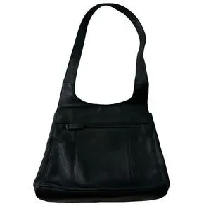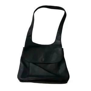 Medium size cross body black. Lay flat against the body inside zipper pocket and outside pocket