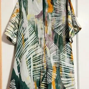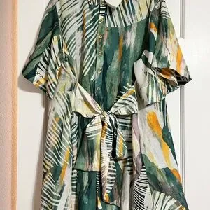 Stylish shirt style romper with a unique green and yellow pattern versatile. Can be tied/belted two ways. Features a classic collar and button-down design. Effortlessly chic!