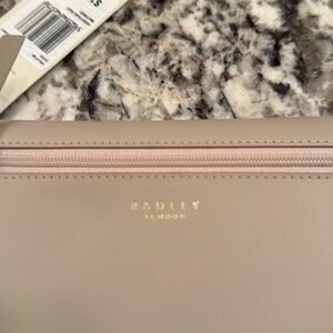 Stylish beige wallet featuring a cute dog logo. Perfect for everyday use. Radley Of London leather stone color