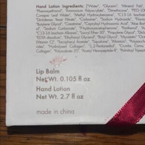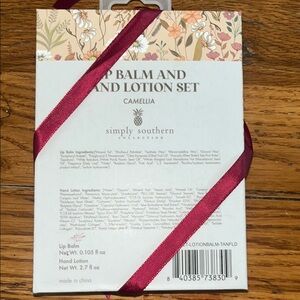 Charming lip balm and hand lotion set. Features floral design. Perfect for daily use. Camellia fragrance. New in box.