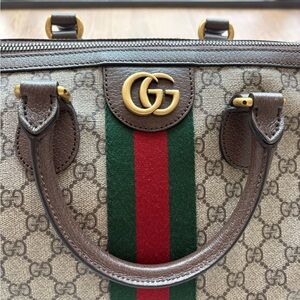 Elegant Gucci duffel with signature monogram. Features green and red stripe. Ideal for travel.
