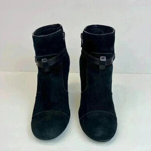 Tory Burch Aaden Women's 9.5 M Ankle Boots Black Suede Harness Logo Emblem Wedge