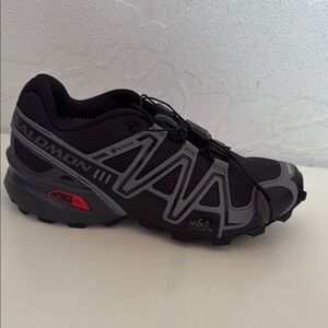 Durable Salomon trail shoes in black and gray. Ideal for rugged terrains. Unisex Men's size 5.