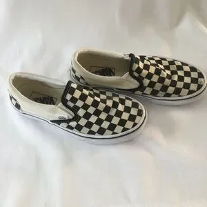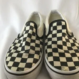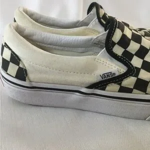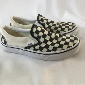 Classic Vans slip-on shoes, featuring a stylish black and white checkered pattern. Perfect for everyday wear with a comfortable fit. Still lots of wear and fun left.