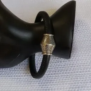 This black leather bracelet has a magnetic closure. The bead has Morracan inspired etching.