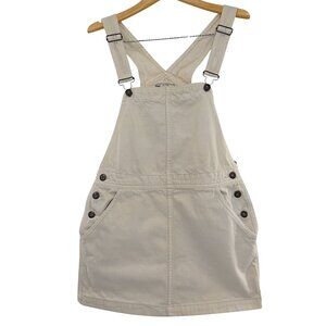 Free People cotton overall dress in a soft cream color, size 30. Features button side closures, front slant and back patch pockets, adjustable straps, and relaxed fit. Utility-inspired boho look perfect for layering. Slight mark on strap shown in photo.