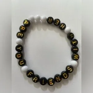 Stylish bracelet with black and white beads. Features gold lettering spelling 'ARE YOU FRIENDS WITH HER'.
