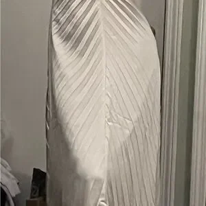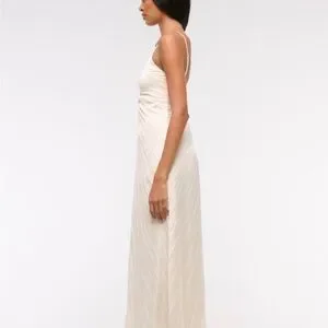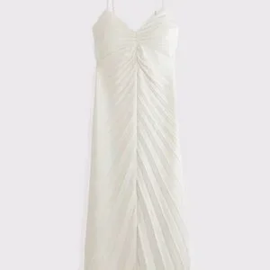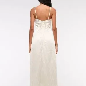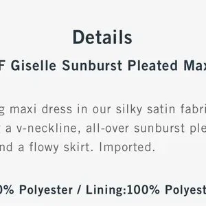 From A&F Site: Flattering maxi dress in our silky satin fabric, featuring a v-neckline, all-over sunburst pleating details and a flowy skirt. Imported.