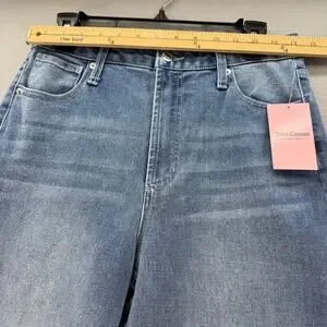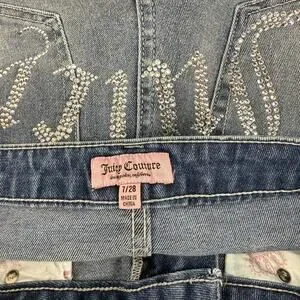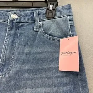 Juicy Couture Women's Denim Jeans. Blue in color. Light denim wash. Tagged size 7/28. These women's Juicy Couture jeans feature a five pocket design, rhinestone rear logo, wide flared leg and a high rise fit. Style number JC624. In new with tag condition - NWT.