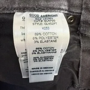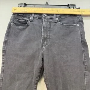 Good American Women's Denim Jeans. Black in color. Dark denim wash. Tagged size 4/27. These women's Good American Jeans feature a five pocket design, a tapered skinny leg and a high rise fit. Style number GL452PT. In preowned condition with minimal signs of wear.
