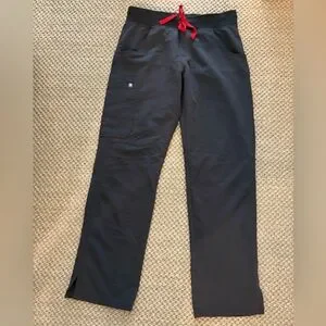 Stylish black pants with a vibrant red drawstring. Comfortable fit. Perfect for work or casual wear.