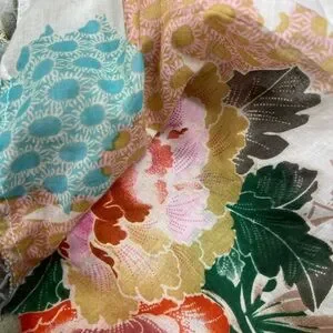 Chic kaftan with a vibrant floral design. Features a blend of pink, green, and yellow tones. Ideal for beachwear.