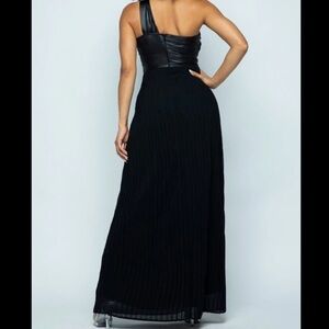 Black maxi dress, featuring a faux leather double layer bodice, one shoulder with cut out detail. Long Pleated Skirt. Small. NWOT