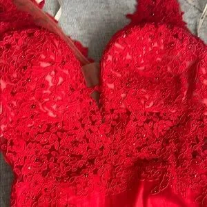 Stunning red gown with intricate lace details. Perfect for formal occasions. I only wore it once for homecoming! Perfect condition