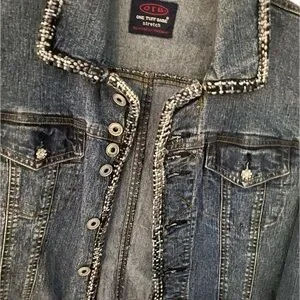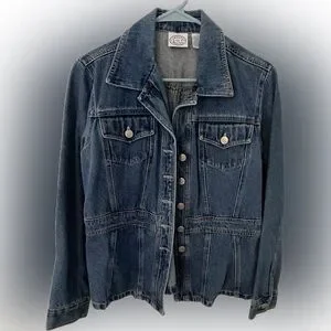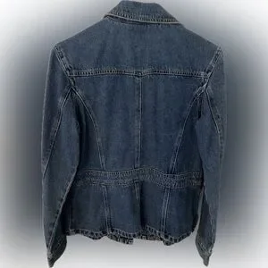 This timeless blue jean jacket features a fitted silhouette and a traditional waist-length cut, offering a slightly worn, casual look. The classic design is enhanced by visible topstitching in a contrasting lighter thread, making it a versatile addition to any wardrobe.