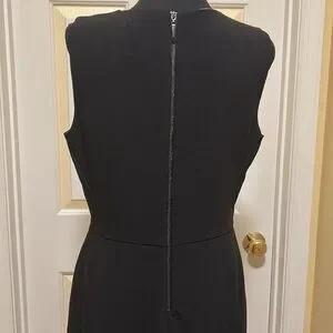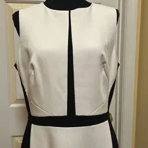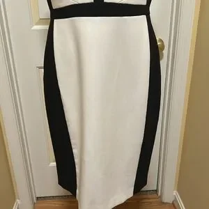 This elegant black and cream sheath dress from White House Black Market is perfect for cocktail events or work settings. Featuring a sophisticated mock neck and sleeveless design, it offers a sleek and modern silhouette. The midi length adds a touch of refinement, making it a versatile addition to any wardrobe. Fresh from dry cleaners.