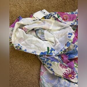 This vibrant sundress from Zara features a playful floral print in pink and yellow, perfect for a wedding guest or resort wear. The sleeveless design with a scoop neckline and maxi length offers a breezy, elegant look ideal for warm weather occasions.