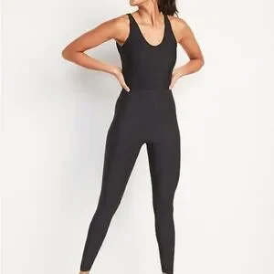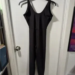 This sleek black jumpsuit features a scoop neckline and wide shoulder straps, offering a streamlined silhouette with its form-fitting design. Made from a stretchy, athletic-style material, it provides comfort and versatility for both exercise and casual wear.