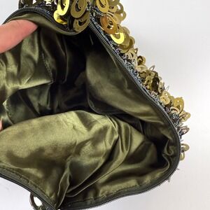 Fabulous vintage Y2K shoulder bag dripping in gold sequins for ultimate early 2000s vibes! Perfect statement piece for parties, festivals, clubbing, or adding some sparkle to any outfit. Features a slouchy hobo shape in an olive green base color with a zip closure and adjustable strap.