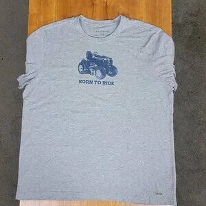 Men's Heather Gray short sleeve crew neck Crusher tee by Life is Good, featuring a graphic of a riding lawnmower and the text "Born to Ride"