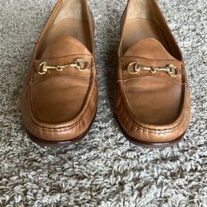 These Cole Haan loafers C09546 are crafted in smooth tan leather, featuring a classic horsebit detail for a touch of elegance. The slip-on design ensures easy wear, while the moccasin-style toe adds a timeless appeal. Men’s size 13M. Good condition!