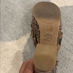 These Chinese Laundry 5” platform sandals feature a go-with-anything embossed snake leather and are remarkably comfortable and wearable. Little sign of wear, and tons of life left.