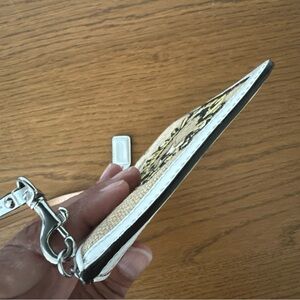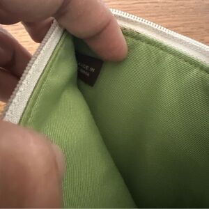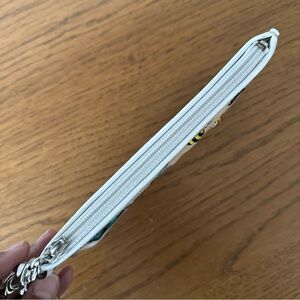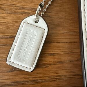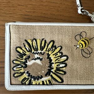 Coach Wristlet / Pouch is a small rectangular purse with a top zip closure and a wrist strap / handle in white leather. The exterior features a brown burlap fabric with poppy flower embellishments and a bumblebee design accented with crystals, silver hardware and has a green fabric lining. Measure approximately 8 in x 4.5 in x .5 in - handle/strap approximately 5 In. Drop When Connected On Both Sides.