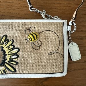 Coach Wristlet Pouch Floral Bumble Bee Crystals Burlap Leather Trim Zip Purse