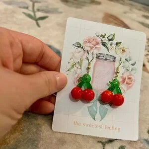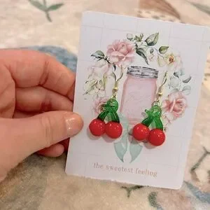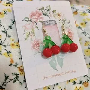 Cute cherry dangle earrings. Red and green glass with golden colored metal hook back earrings