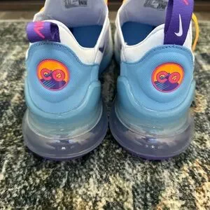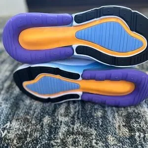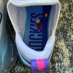Stylish Nike Air Max 270 featuring a white base with blue overlays. Purple accents and vibrant pink logo add flair. These are released in conjunction with the Colorado Rockies new City Connect uniforms for 2025. Retail for $170. Never worn. Perfect condition. Size 11.5 men’s U.S.