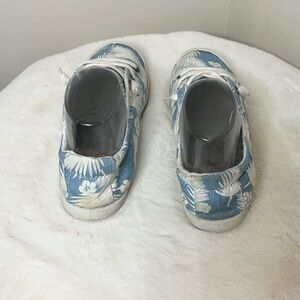 Chic floral sneakers with a blue and white design. Perfect for casual wear. Comfortable and stylish. Size 8.5, slip ins. Nonsmoking, pet friendly home.