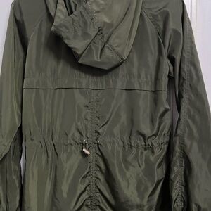 LIKE NEW! Adjustable cinches comfortable olive green hooded rain windbreaker jacket with gold button zipper and cinch accents. Perfect for any wind or rain with attached hood. All buttons and zippers work perfect.