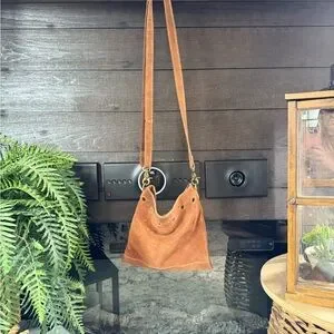 Stylish suede crossbody bag. Rich tan color. Perfect for casual outings.