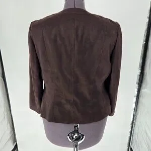 Add timeless elegance to your wardrobe with this Talbots size 14 open front blazer in a rich chocolate brown. Made from 100% polyester, it offers a soft, brushed texture that mimics the feel of suede—perfect for both casual and dressy occasions. Design Features include an open front (no buttons), two chest pockets and 2 two front hip pockets with a scoop collar. The tag recommends dry clean only, but it has been previously washed on a cold, gentle cycle and line dried. It is in excellent pre-owned condition. This is a versatile layering piece that transitions effortlessly from office to weekend wear.
