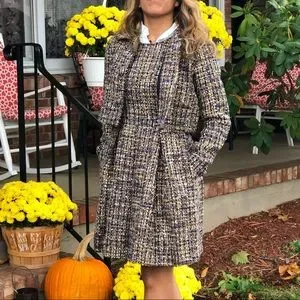 Chic tweed coat with a tailored fit. Features a blend of colors for a stylish look. Perfect for any occasion.