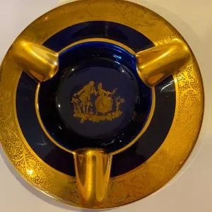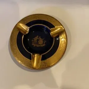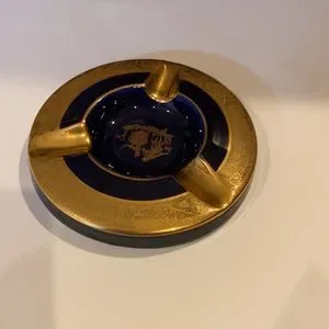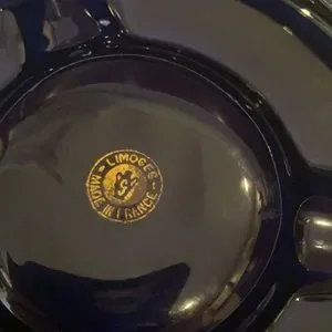 LIMOGES ORNATE NAVY AND GOLG AMAZING ASHTRAY. WE DON’T SMOKE ANYTHING SO ITS NOW UP FOR GRABS. FOR THOSE WHO SMOKE THIS IS A CONVERSATION PIECE. MADE IN FRANCE