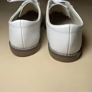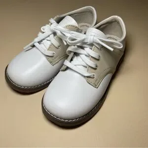These stylish kids shoes feature a classic white and tan design, perfect for any occasion. Comfortable and durable, they are ideal for active little ones. Leather shoes that will be sure to last! Worn once for photos