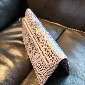 This is a gorgeous iridescent Brahmin wallet in "violet wonderland" crocodile printed leather. A gorgeous medley of lavender, silver, aqua with gold hardware. The measurements are 8" wide x 4" tall. There is a zippered coin pocket on the outside. Inside is clear pocket for photo ID, 3 long pockets for checkbook or paper money. In addition there are 12 card holder pockets. A great gift for any purple lover.