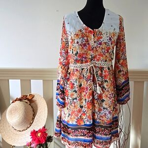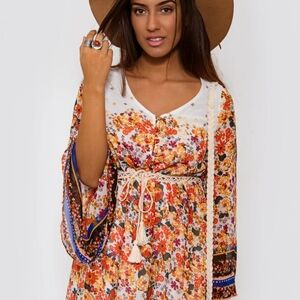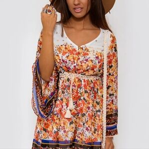 A fabulous blend of boho-chic and cottagecore vibes, this dress is your ticket to effortless style. The vibrant floral print dances across a dreamy landscape of oranges and whites, while the lightweight, flowy sleeves provide the perfect touch of elegance.
