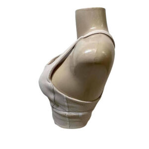 This is a pre-owned sports bra, brand unknown. It features a ribbed texture throughout. The bra has a racerback design with multiple crisscrossing straps. The material appears to be a blend of synthetic fibers, possibly nylon and spandex. There are no visible stains or tears. The bra is a light beige color. The band provides support.