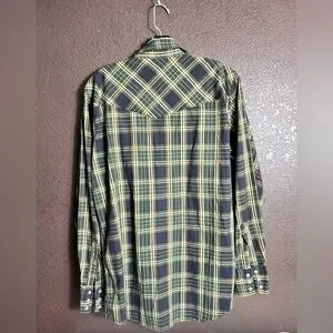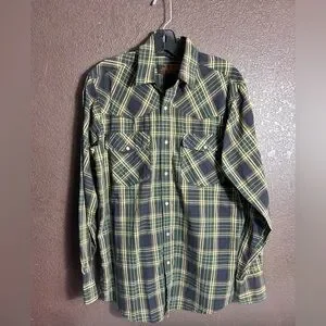 Men’s Med Casual Green, Navy and Yellow Pearl Snap Shirt