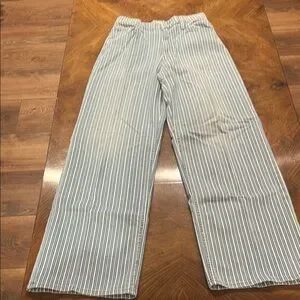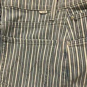 Chic high rise jeans with blue and white stripes. Perfect for a stylish look.