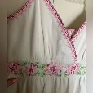 They say everything comes back in style and this dress is the testament! It’s absolutely stunning and built beautifully. Fully lined, in immaculate condition and the cross stitch roses & bows details are so trendy! Absolutely stunning. Generous room in the bust so if you’re a busty gal this is for you! Tragically this dress no longer fits and I can’t justify hanging onto it any longer! Would be the perfect dress for a bridal shower or wedding rehearsal.