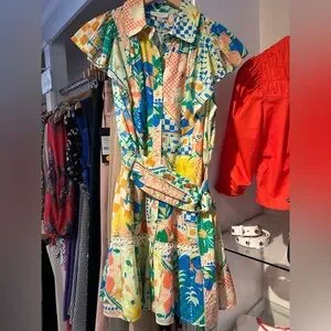 Best selling cotton poplin Marceline dress is back, now in a bright printed design. This daydress features a smocked elastic waist, feminine flutter sleeves, and a relaxed A-line silhouette. Plus, the bold, colorful print is a guaranteed conversation starter, it features bees, flowers and more. Size Small. New with tags!