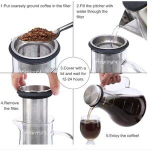 Aebitsry Cold Brew Coffee Maker will provide the best Clod Brewing system which can make 77% less acidity per brew than traditional iced or hot coffee, but preserving all the freshness and aroma of cold brew coffee or tea. It is tasty and healthy for you who are the Favorite of Coffee or Tea. It can be also used for Homemade Juice.