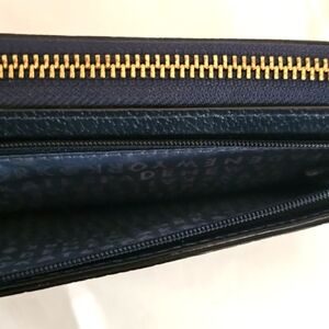 Preowned dark blue Kate Spade large wallet with tan lining.