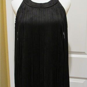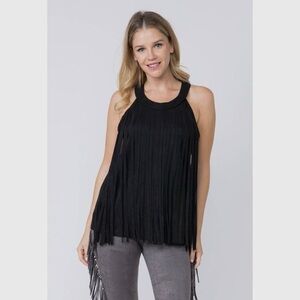 Elevate your style with this chic black fringe sleeveless top. Perfect for a night out or casual day wear. The flowing fringe adds a touch of elegance and movement.