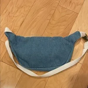 Stylish blue denim crossbody bag with a white strap. Features a gold zipper for secure closure.
