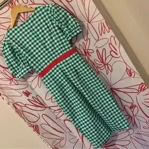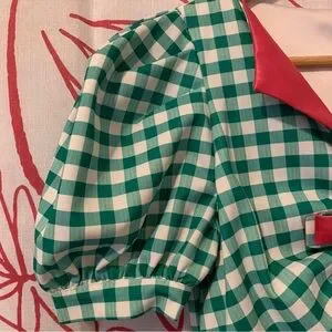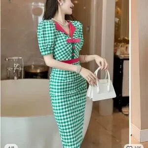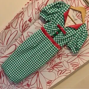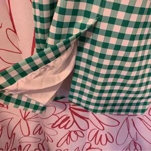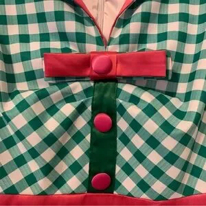 Retro Pin Up Wiggle Midi Dress. Green, Pink and White. Super sweet plaid print with pink contrasts, bodycon curve hugging Marilyn Monroe fit, bodice buttons and bow detail, puff sleeve, fitted waist, back hidden zipper, fully lined, polyester type material with good stretch. Gently used, excellent condition, no stains or tears, see pictures for details.