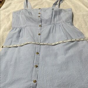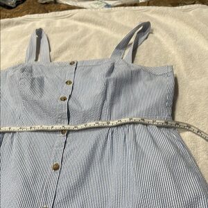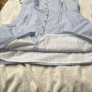 This casual mini sundress from J. Crew features a charming square neckline and a sleeveless design, perfect for warm days. The blue and white color palette adds a fresh touch, while the buttoned front enhances its laid-back style. Ideal for casual outings, this dress combines comfort with a chic, summery vibe.